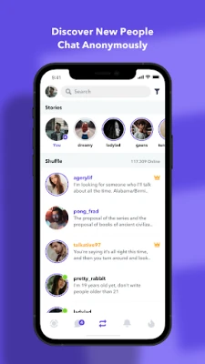 Unlike most chat apps, your appearance is unimportant here, to meet and chat with new people, no one has to like or match you, pick a random person listed in the shuffle list and say hi.
