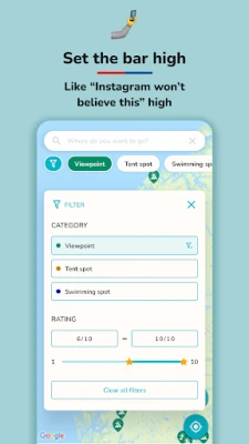 Quickly narrow your search by category or rating, whether you're looking for a perfect swimming spot or a hidden camping gem.